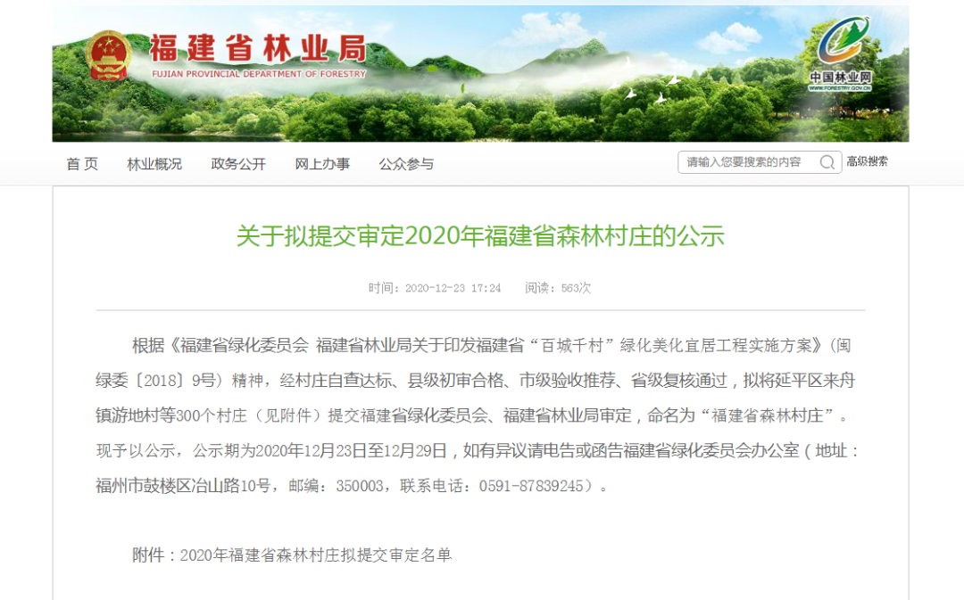 根據《福建省綠化委員會 福建省林業局關于印發福建省“百城千村”綠化美化宜居工程實施方案》(閩綠委〔2018〕9號) 精神,經村莊自查達標、縣級初審合格、市級驗收推薦、省級復核通過,擬將延平區來舟鎮游地村等300個村莊(見附件)提交福建省綠化委員會、福建省林業局審定,命名為“福建省森林村莊”。 公示期為2020年12月23日至12月29日。