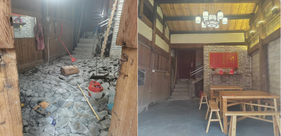 整改前后 因此,九舉巷2號鄭桂蘭家就成了泰寧縣工信局的結對幫扶對象。在后續的幫扶過程中,泰寧縣工信局聯合杉城鎮多次組織相關工作人員到鄭阿姨家實地走訪,討論改造內容,邀請裝修隊設計大廳布局,并在“五一”假期前完成廳堂改造,讓鄭阿姨能夠在旅游高峰期開門營業的同時繼續完成后續改造內容。 “接下來,我們還將對鄭阿姨老宅的后院進行進一步的修繕改造,讓他們在傳統民居中享受現代生活的便利。”泰寧縣工信局相關負責人說。