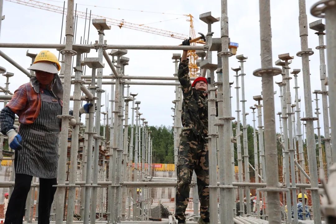 6月21日,在三明市金湖旅游職業中專學校建設工程(一期)施工現場,塔吊林立,機械聲轟鳴,裝載車輛來回穿梭,工人們正在進行鋼筋綁扎、模板固定等施工作業,一派熱火朝天的繁忙景象。
