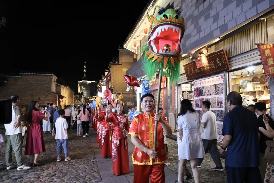 非遺舞臺上,身著華麗戲服的梅林戲演員跟隨鼓點出場,清亮唱腔與矯健身段引來觀眾陣陣喝彩。省級非物質(zhì)文化遺產(chǎn)“上青古樂”悠然奏響,傳承人們手持笛、簫、嗩吶等古老樂器,演繹著穿越時空的韻律,吸引了大量游客駐足聆聽。與此同時,街頭巷尾,山歌擂茶、民俗踩街、“街角遇見你”街頭藝術(shù)等豐富多彩的文化節(jié)目精彩上演,魚子燈動如流螢,將夜色點綴得如夢似幻。 值得一提的是,泰寧推出的集章活動深受游客歡迎。游客手持集章冊,穿梭在尚書第等古建筑之間,集滿印章后可兌換“一日傳承人”證書和禮品,這讓文化體驗變得更加有趣。